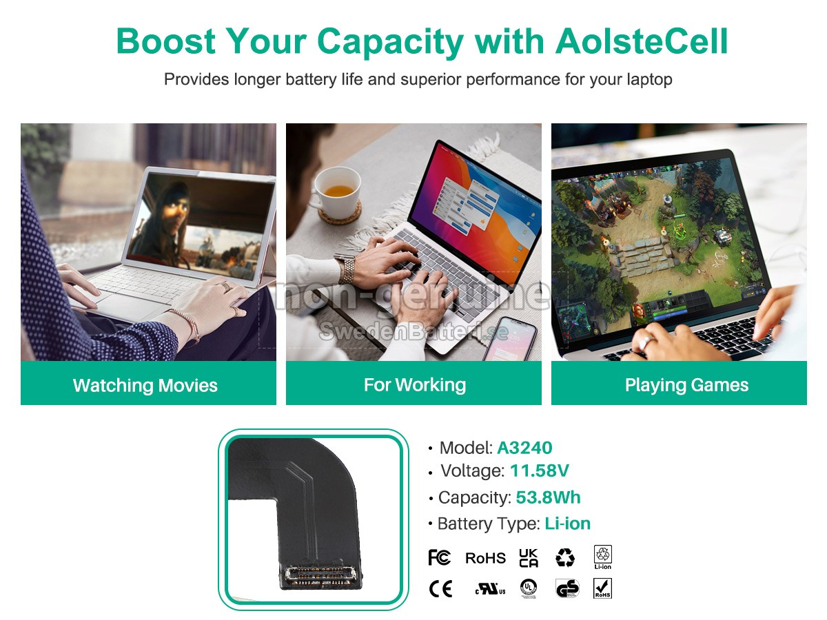 Det nya Apple MacBook Air 13 inch M4 2025 ersättningsbatteri för laptop i originalkvalitet är gjort av ett nyimporterat Grad A + batteri, TI-chip från Texas och ABS + PC miljöskyddssmaterialsom klarar höga temperaturer och är slitageskyddat, och som har genomgått mer än 100 säkerhetstester. Alla våra Apple MacBook Air 13 inch M4 2025 laptopersättningsbatterier är förenliga med CE, UL, ROHS, ISO9001/9002 certifieringsstandarder, dess design är i linje med OEM-specifikationer och 100% kompatibelt med originalspecifikationer. Prestandan är stabilare, väntetiden är längre, nya Apple MacBook Air 13 inch M4 2025 ersättningsbatteri av originalkvalitet passar olika omständigheter, så du kan använda din laptop närsomhelst, och slipper oroa dig över batteriet!