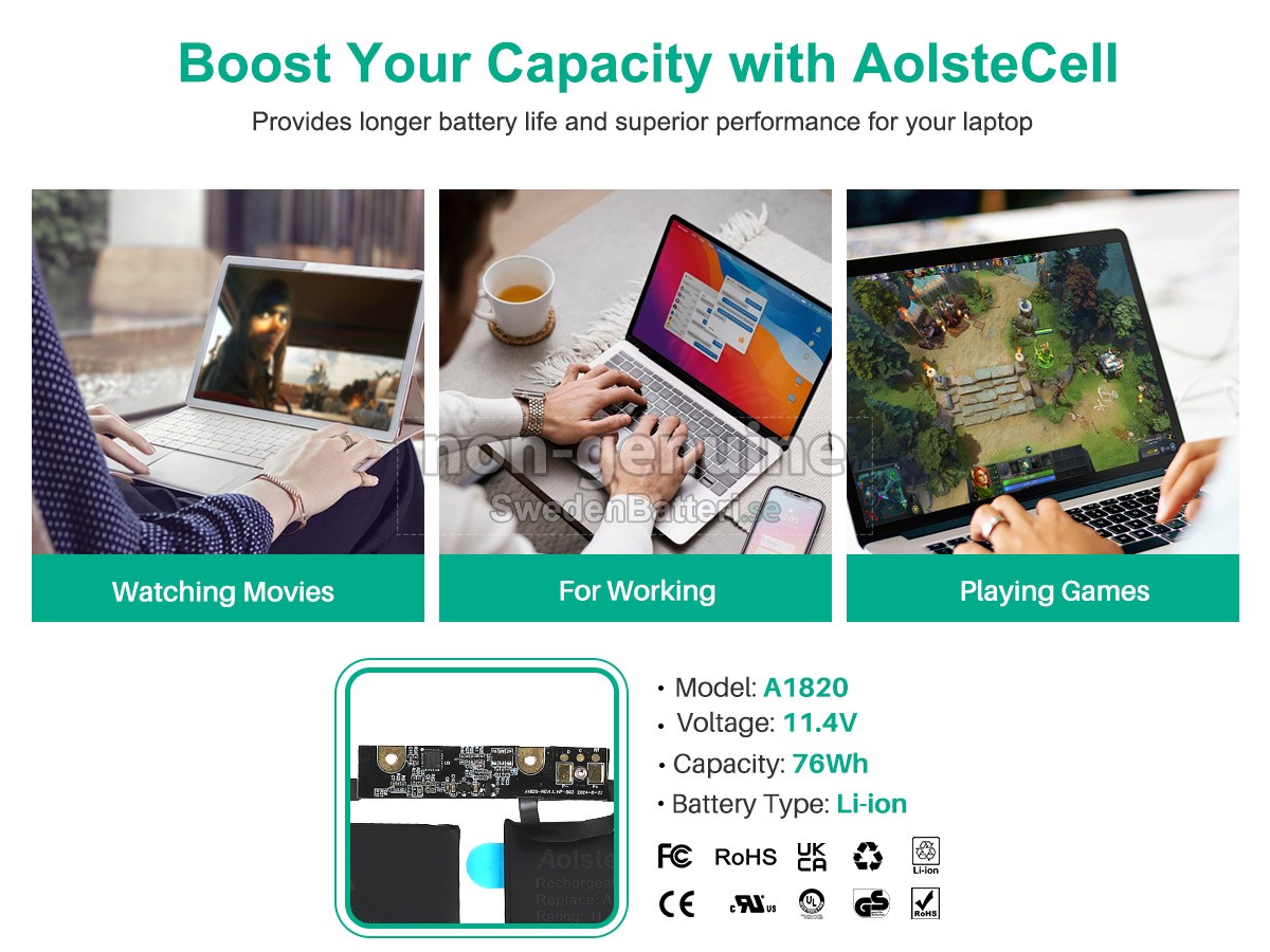 Det nya Apple MacBook Pro Core I7 3.1GHZ 15.4 inch TOUCH A1707(EMC 3162) ersättningsbatteri för laptop i originalkvalitet är gjort av ett nyimporterat Grad A + batteri, TI-chip från Texas och ABS + PC miljöskyddssmaterialsom klarar höga temperaturer och är slitageskyddat, och som har genomgått mer än 100 säkerhetstester. Alla våra Apple MacBook Pro Core I7 3.1GHZ 15.4 inch TOUCH A1707(EMC 3162) laptopersättningsbatterier är förenliga med CE, UL, ROHS, ISO9001/9002 certifieringsstandarder, dess design är i linje med OEM-specifikationer och 100% kompatibelt med originalspecifikationer. Prestandan är stabilare, väntetiden är längre, nya Apple MacBook Pro Core I7 3.1GHZ 15.4 inch TOUCH A1707(EMC 3162) ersättningsbatteri av originalkvalitet passar olika omständigheter, så du kan använda din laptop närsomhelst, och slipper oroa dig över batteriet!