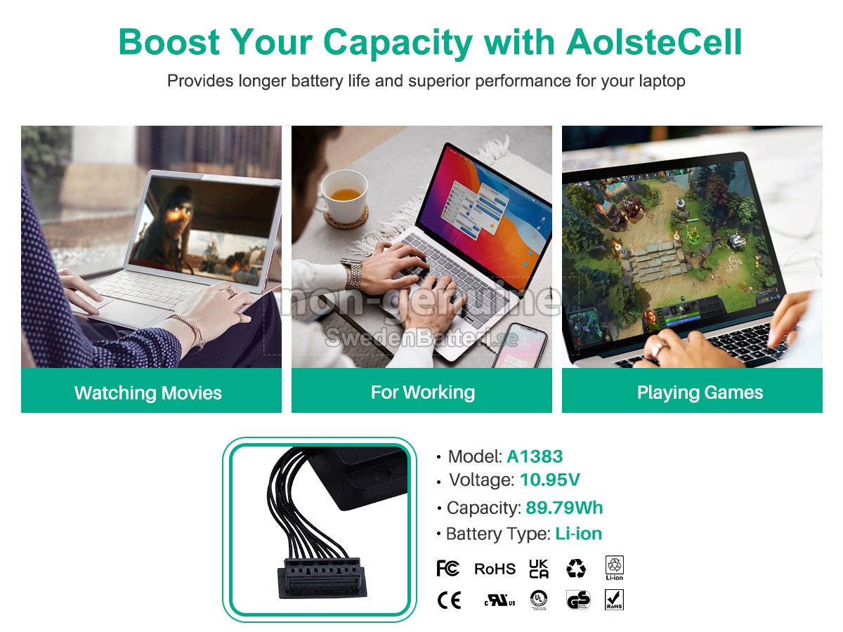 Det nya Apple MC725LL/A ersättningsbatteri för laptop i originalkvalitet är gjort av ett nyimporterat Grad A + batteri, TI-chip från Texas och ABS + PC miljöskyddssmaterialsom klarar höga temperaturer och är slitageskyddat, och som har genomgått mer än 100 säkerhetstester. Alla våra Apple MC725LL/A laptopersättningsbatterier är förenliga med CE, UL, ROHS, ISO9001/9002 certifieringsstandarder, dess design är i linje med OEM-specifikationer och 100% kompatibelt med originalspecifikationer. Prestandan är stabilare, väntetiden är längre, nya Apple MC725LL/A ersättningsbatteri av originalkvalitet passar olika omständigheter, så du kan använda din laptop närsomhelst, och slipper oroa dig över batteriet!