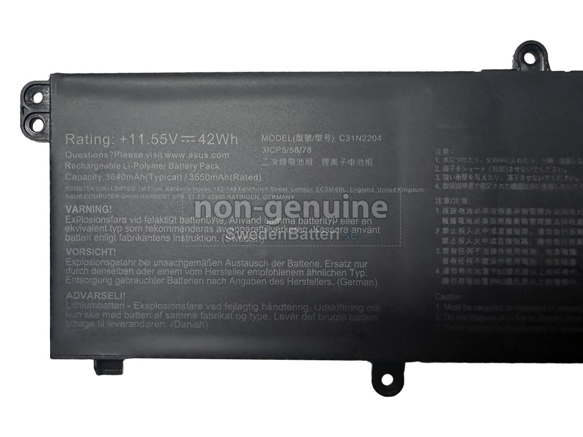 Det nya Asus C31N2204 ersättningsbatteri för laptop i originalkvalitet är gjort av ett nyimporterat Grad A + batteri, TI-chip från Texas och ABS + PC miljöskyddssmaterialsom klarar höga temperaturer och är slitageskyddat, och som har genomgått mer än 100 säkerhetstester. Alla våra Asus C31N2204 laptopersättningsbatterier är förenliga med CE, UL, ROHS, ISO9001/9002 certifieringsstandarder, dess design är i linje med OEM-specifikationer och 100% kompatibelt med originalspecifikationer. Prestandan är stabilare, väntetiden är längre, nya Asus C31N2204 ersättningsbatteri av originalkvalitet passar olika omständigheter, så du kan använda din laptop närsomhelst, och slipper oroa dig över batteriet!