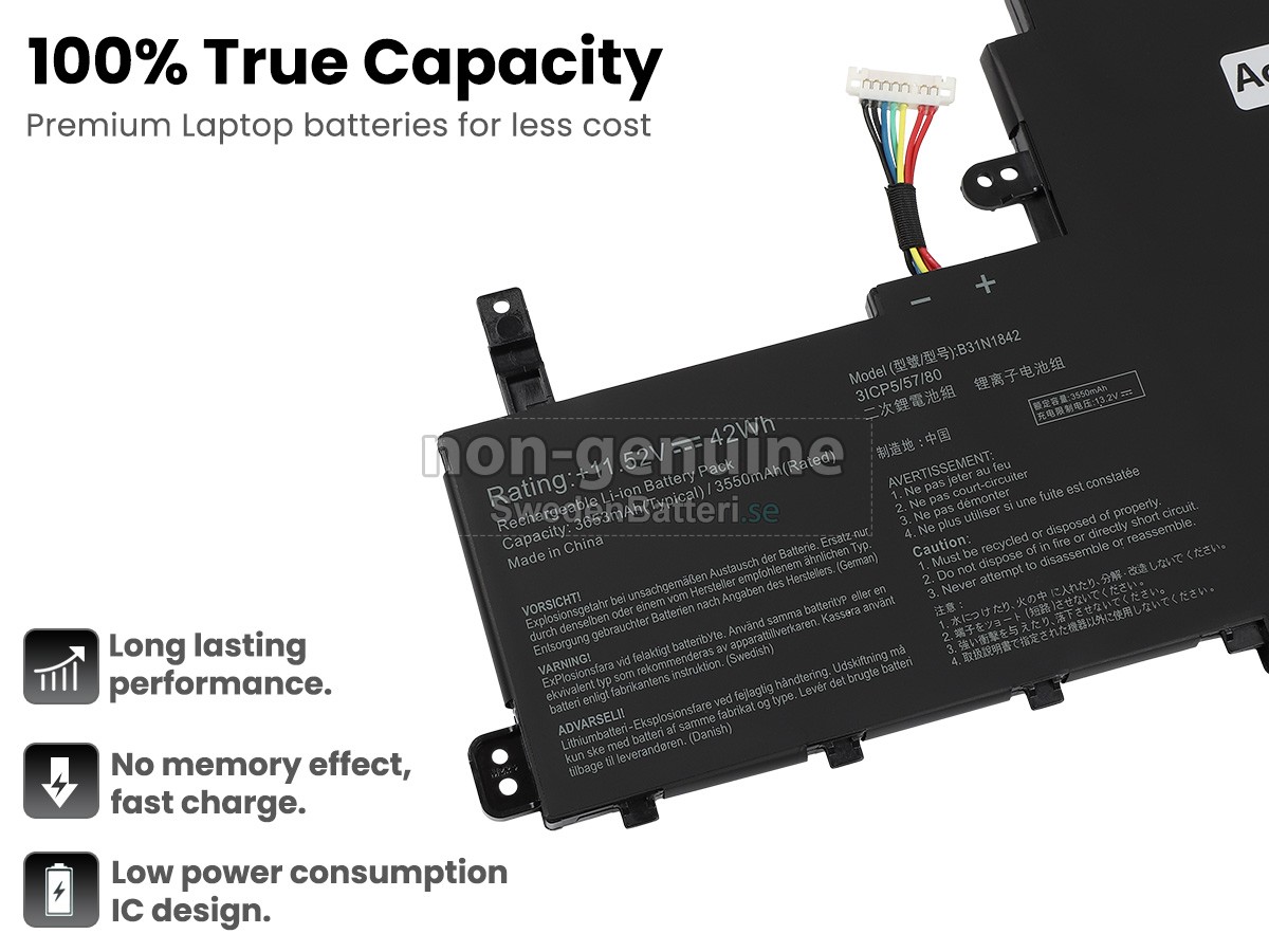 Det nya Asus VivoBook 15 X513EA ersättningsbatteri för laptop i originalkvalitet är gjort av ett nyimporterat Grad A + batteri, TI-chip från Texas och ABS + PC miljöskyddssmaterialsom klarar höga temperaturer och är slitageskyddat, och som har genomgått mer än 100 säkerhetstester. Alla våra Asus VivoBook 15 X513EA laptopersättningsbatterier är förenliga med CE, UL, ROHS, ISO9001/9002 certifieringsstandarder, dess design är i linje med OEM-specifikationer och 100% kompatibelt med originalspecifikationer. Prestandan är stabilare, väntetiden är längre, nya Asus VivoBook 15 X513EA ersättningsbatteri av originalkvalitet passar olika omständigheter, så du kan använda din laptop närsomhelst, och slipper oroa dig över batteriet!