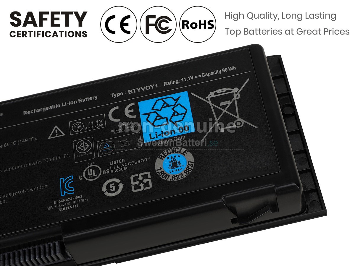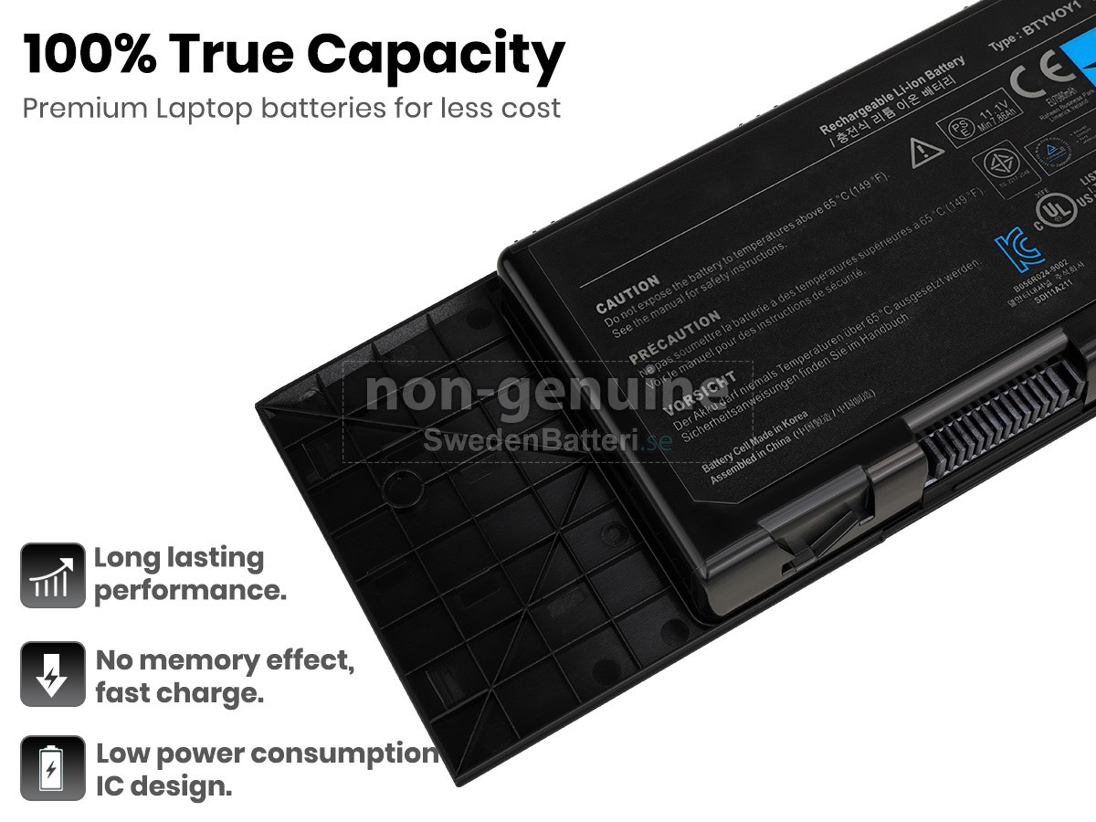 Det nya Dell Alienware M17X R3 ersättningsbatteri för laptop i originalkvalitet är gjort av ett nyimporterat Grad A + batteri, TI-chip från Texas och ABS + PC miljöskyddssmaterialsom klarar höga temperaturer och är slitageskyddat, och som har genomgått mer än 100 säkerhetstester. Alla våra Dell Alienware M17X R3 laptopersättningsbatterier är förenliga med CE, UL, ROHS, ISO9001/9002 certifieringsstandarder, dess design är i linje med OEM-specifikationer och 100% kompatibelt med originalspecifikationer. Prestandan är stabilare, väntetiden är längre, nya Dell Alienware M17X R3 ersättningsbatteri av originalkvalitet passar olika omständigheter, så du kan använda din laptop närsomhelst, och slipper oroa dig över batteriet!