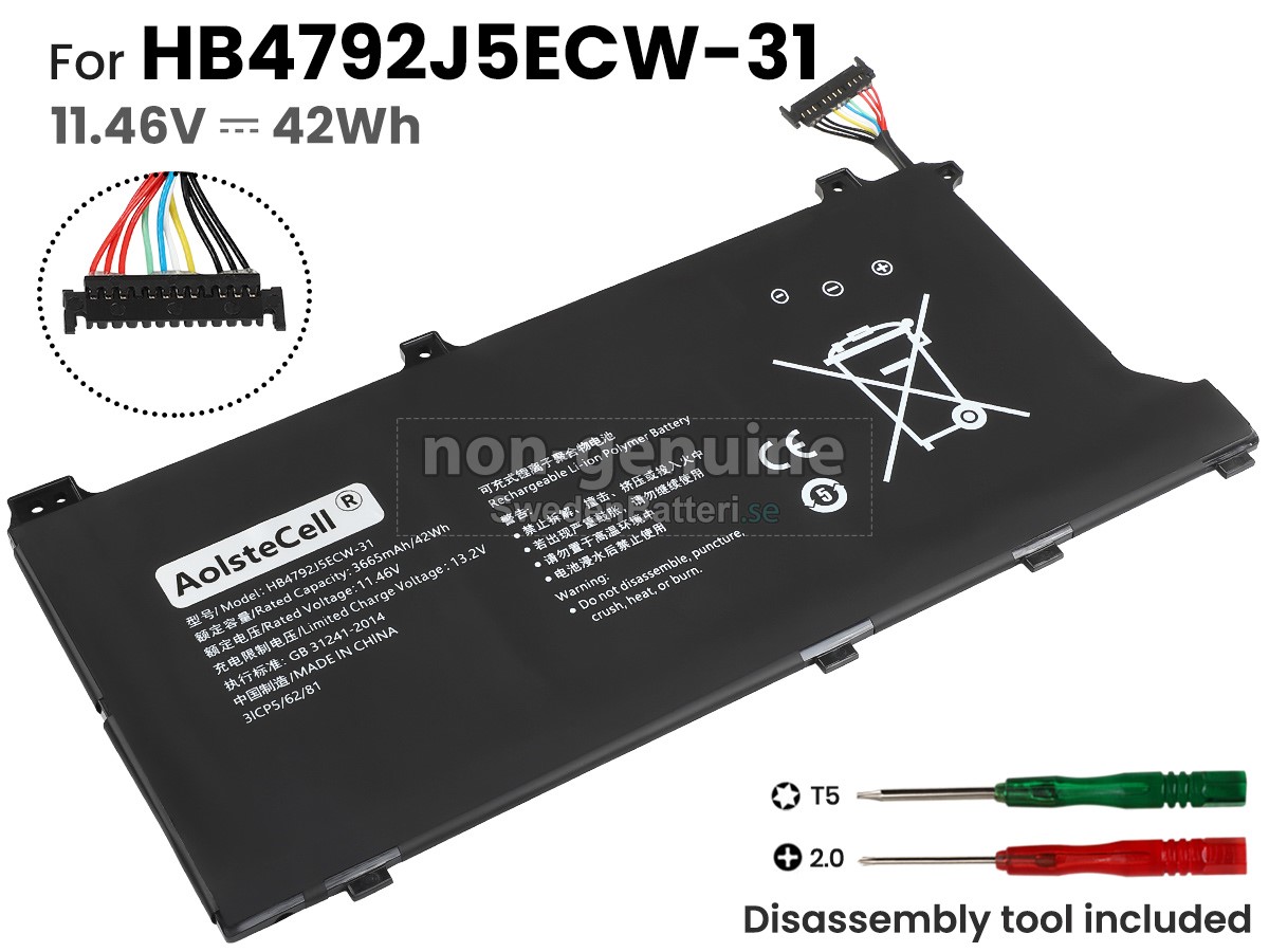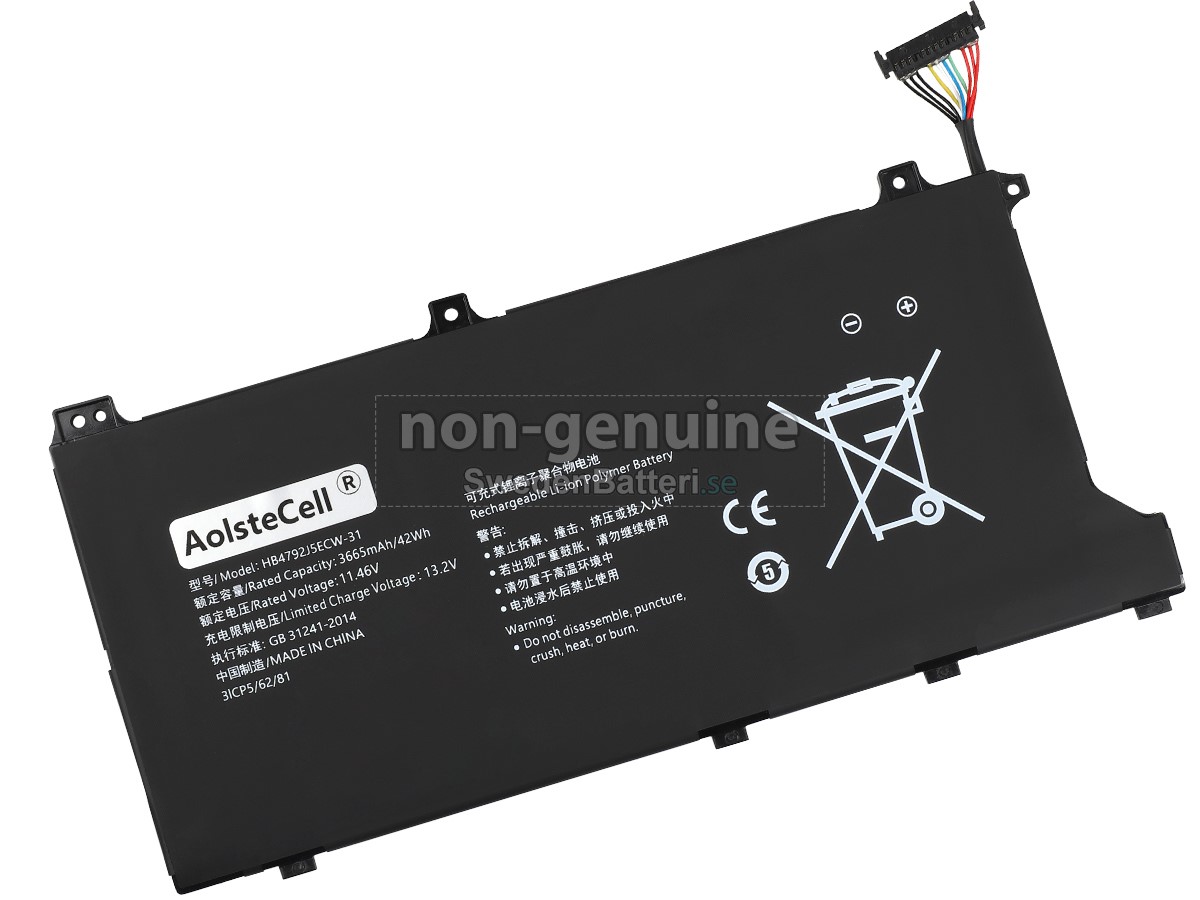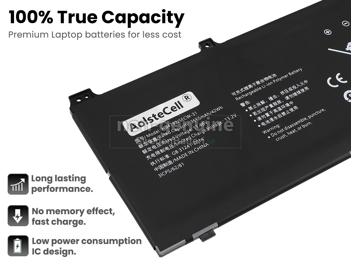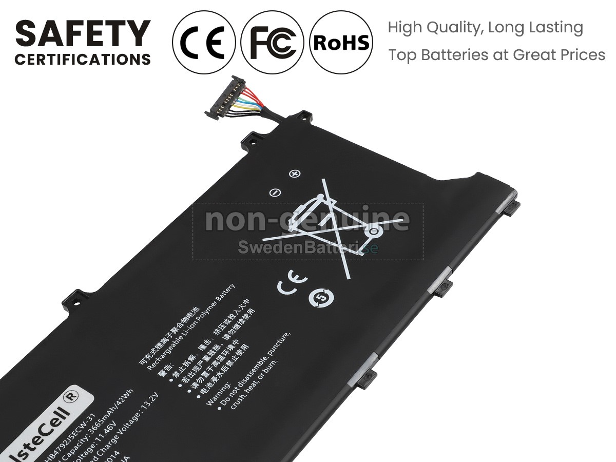 Det nya Huawei HB4792J5ECW-31 ersättningsbatteri för laptop i originalkvalitet är gjort av ett nyimporterat Grad A + batteri, TI-chip från Texas och ABS + PC miljöskyddssmaterialsom klarar höga temperaturer och är slitageskyddat, och som har genomgått mer än 100 säkerhetstester. Alla våra Huawei HB4792J5ECW-31 laptopersättningsbatterier är förenliga med CE, UL, ROHS, ISO9001/9002 certifieringsstandarder, dess design är i linje med OEM-specifikationer och 100% kompatibelt med originalspecifikationer. Prestandan är stabilare, väntetiden är längre, nya Huawei HB4792J5ECW-31 ersättningsbatteri av originalkvalitet passar olika omständigheter, så du kan använda din laptop närsomhelst, och slipper oroa dig över batteriet!