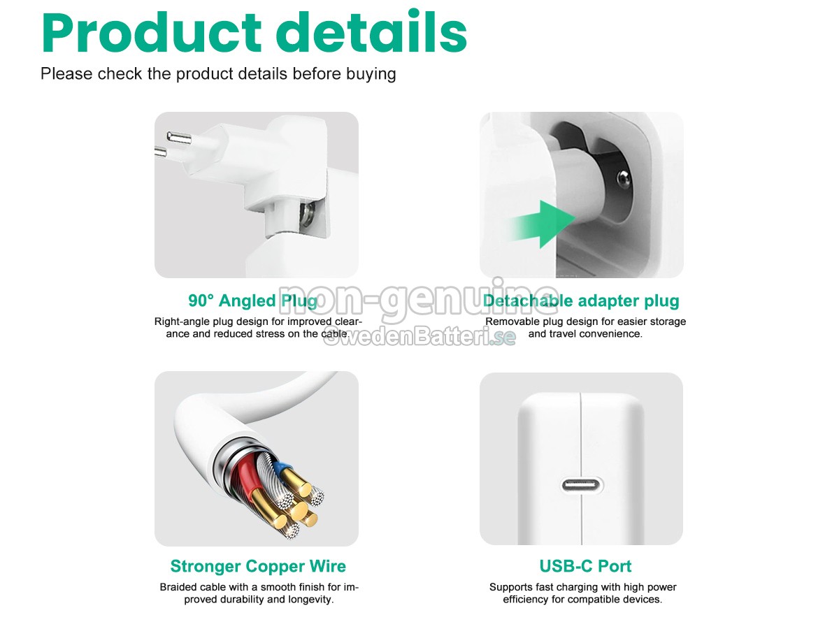 Som ett professionellt adapterföretag i Sverige är vi dedikerade till att erbjuda dig högkvalitativa adaptrar. Vi ställer höga krav på oss själva, tar stort ansvar för våra kunder, och levererar produkter med genuin "kärna" som du kan lita på. Vi säljer inte bara adaptrar, utan även service och förtroende! Vi erbjuder ett års fri ersättning och en 30-dagars pengarna tillbaka-garanti. Den splitternya Apple 61W 20.3V-3A TYPE-C nätadapter är av originalkvalitet och har högsta "kärn"-kvalitet, vilket ger dig dubbel trygghet.