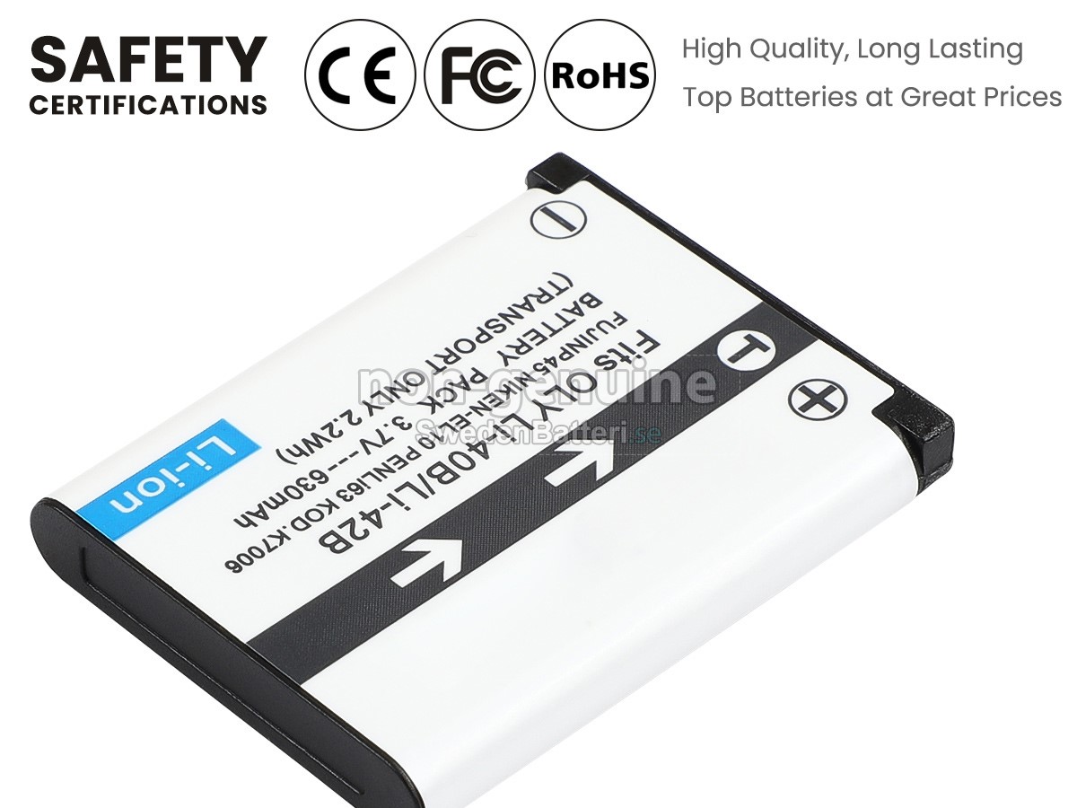 Om din enhet slutar fungera eller inte fungerar är det dags att byta ut batteri. Det nya Olympus FE-160 ersättningsbatteri i originalkvalitet är gjort av ett nyimporterat Grad A + batteri, TI-chip från Texas och ABS + PC miljöskyddssmaterialsom klarar höga temperaturer och är slitageskyddat, och som har genomgått mer än 100 säkerhetstester. Alla våra Olympus FE-160 ersättnings batterier är förenliga med CE, UL, ROHS, ISO9001/9002 certifieringsstandarder, dess design är i linje med OEM-specifikationer och 100% kompatibelt med originalspecifikationer. Prestandan är stabilare, väntetiden är längre, nya Olympus FE-160 ersättningsbatteri av originalkvalitet passar olika omständigheter, så du kan använda din utrustning närsomhelst, och slipper oroa dig över batteriet!